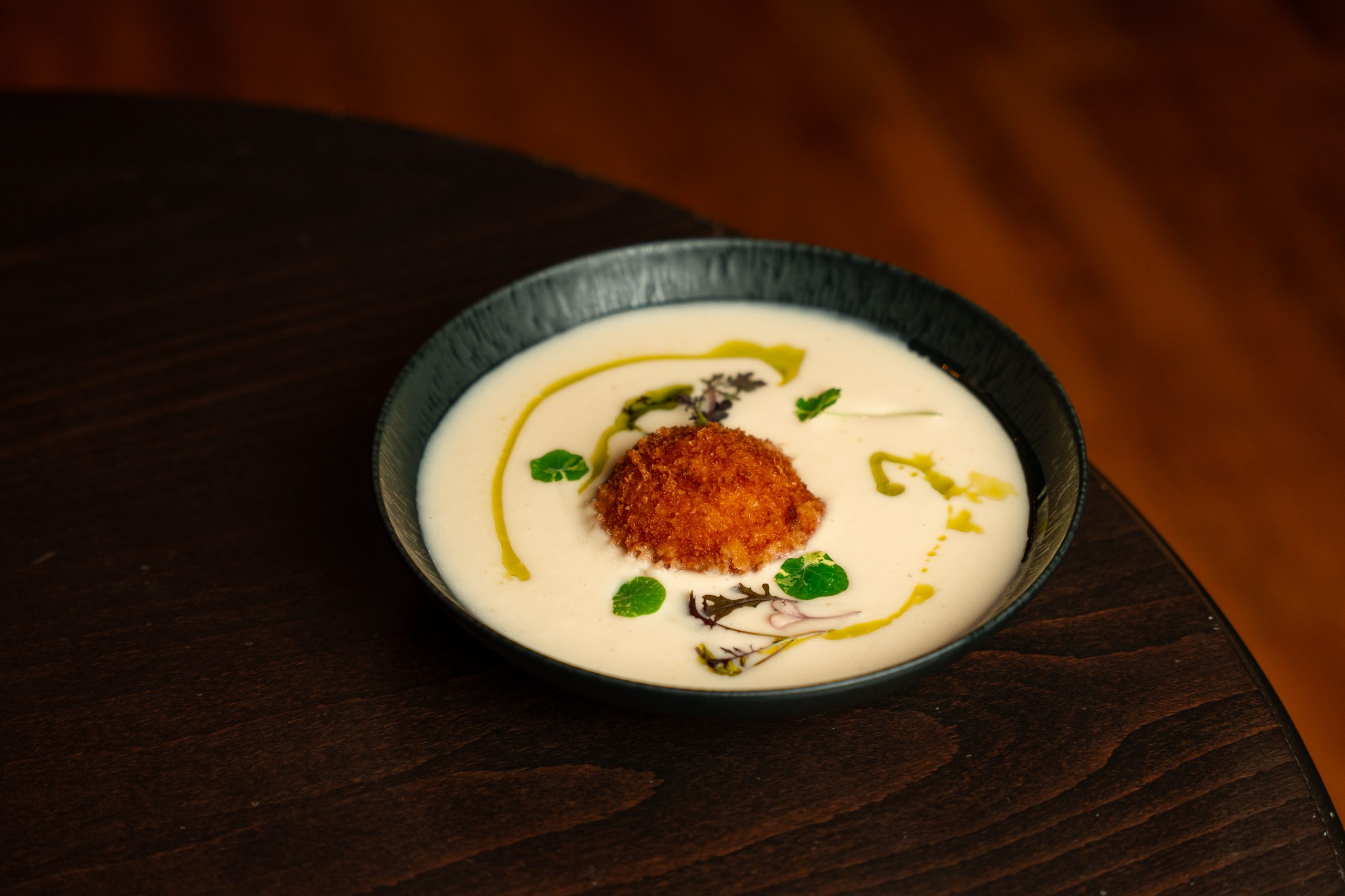 Cream of parsnip soup with pumpkin ’nduja' and arancini
