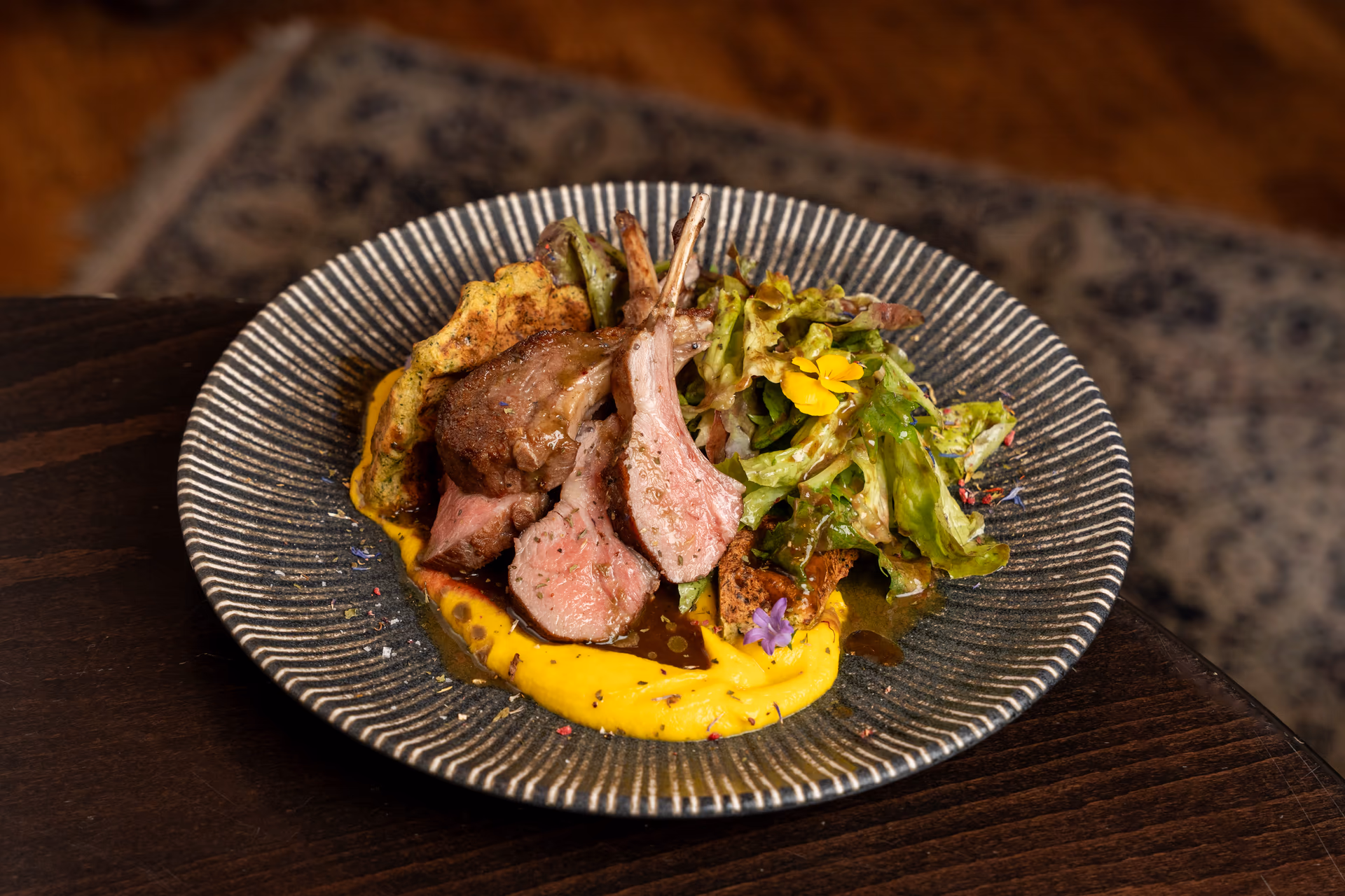 Lamb french racks, carrot purée, broccoli waffels, green salad with pistachio dressing