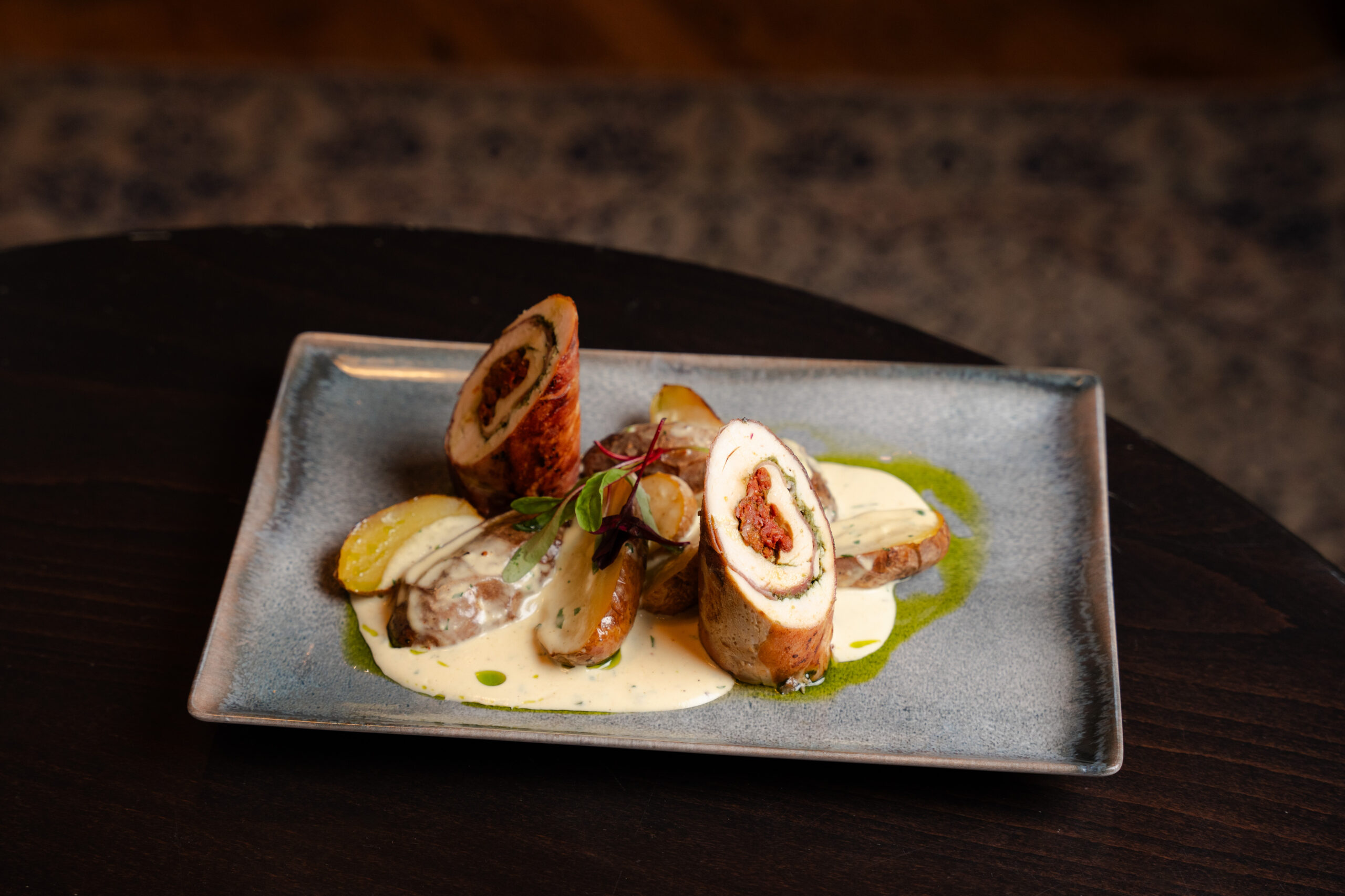 Chicken involtini „parma ham wrapped chicken breast stuffed with sun dried tomato and pesto” skin on roasted potatoes, parmesan sauce